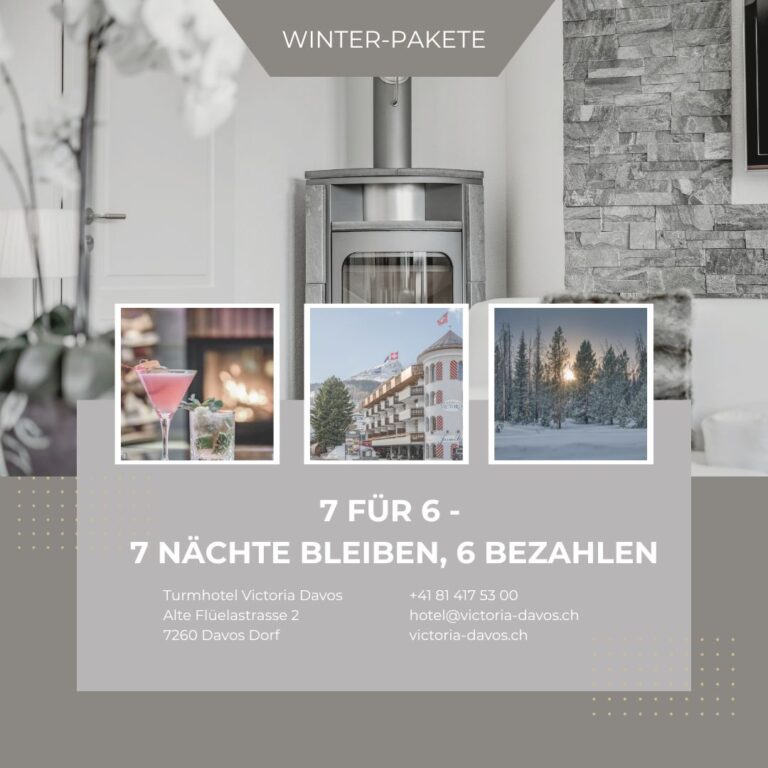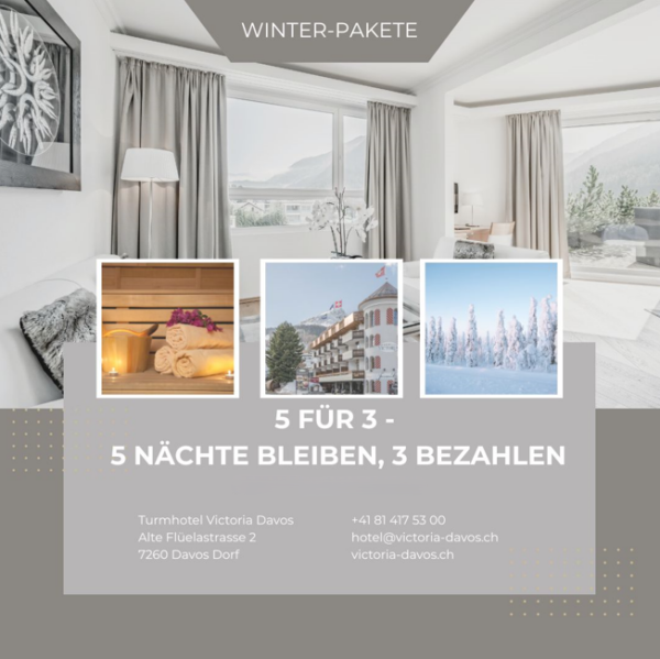 Als Gast unseres «Swiss Charme & Alpine» Hotels Victoria erhalten Sie bereits ab einer Nacht die kostenlose Davoser Gästekarte. Freuen Sie sich auf Ihren Aufenthalt im Zeichen der feinsten Kulinarik, der absoluten Entspannung und des aktiven Genusses in Davos!